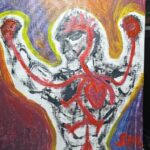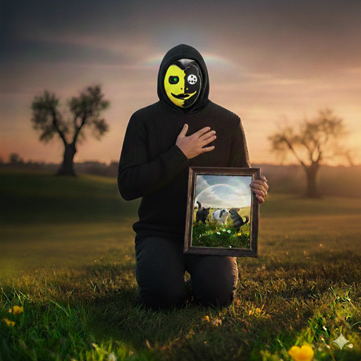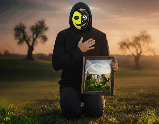 E’ la rappresentazione di una maschera disegnata sulla mia faccia reale che riprende lo smile :-). Il sorriso è per ricordarci nel bene e nel male di cercare e vivere sempre con gioia ed ironia.La divisione in due della faccia non è da intendere negativamente come ambiguità di vero o falso e buono o cattivo…